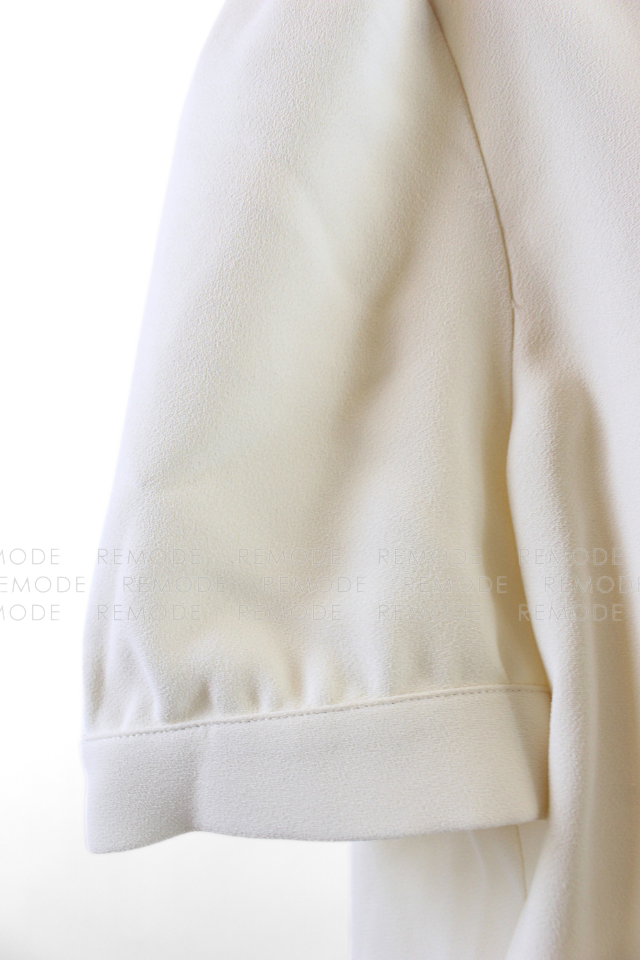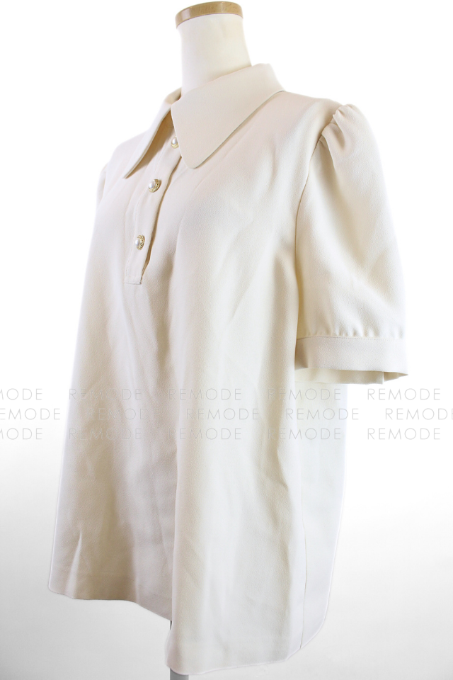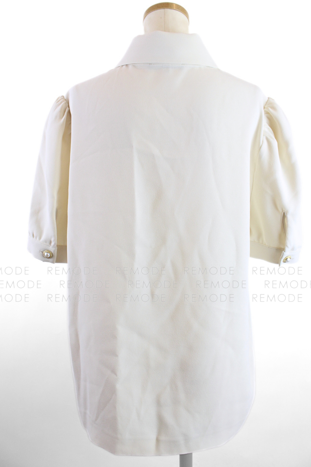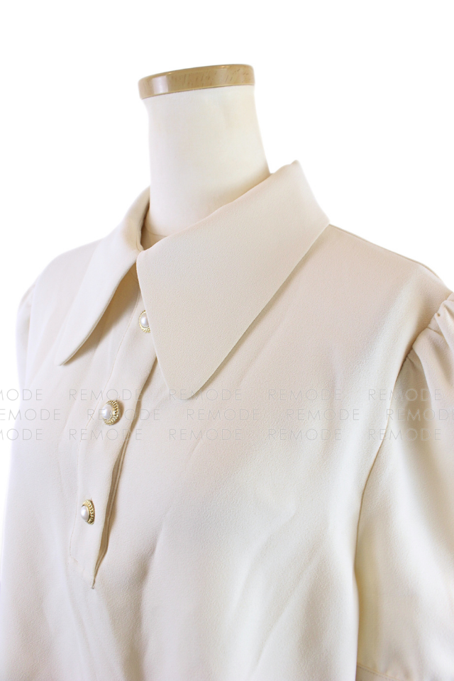 - パフスリーブとパール調ボタンが華やかさを添える、上品なブラウス。