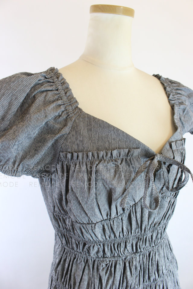 身幅はバックリボンで調整可、ウエスト回りはシャーリング素材で伸縮性があり