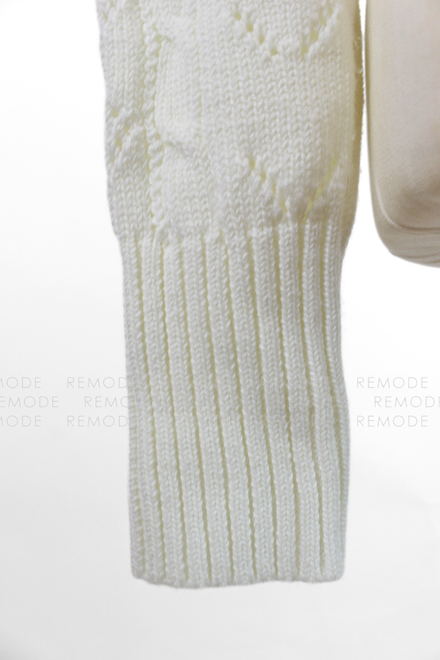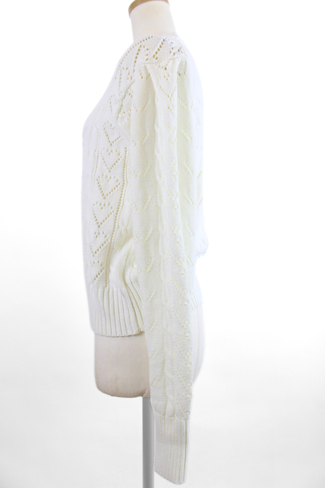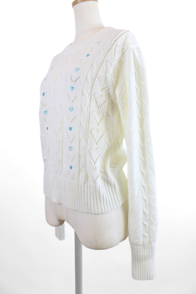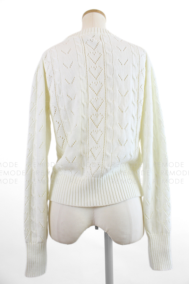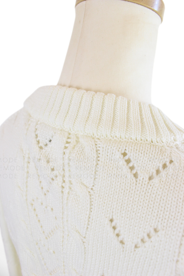 - ケーブル編みとハートのアイレット刺繍が可愛いセーター。梳毛タッチの糸を使い、ガーリーなモチーフでも落ち着いた上品な印象に。プレッピーな雰囲気で、カジュアルからきれいめコーデまで幅広く活躍します。