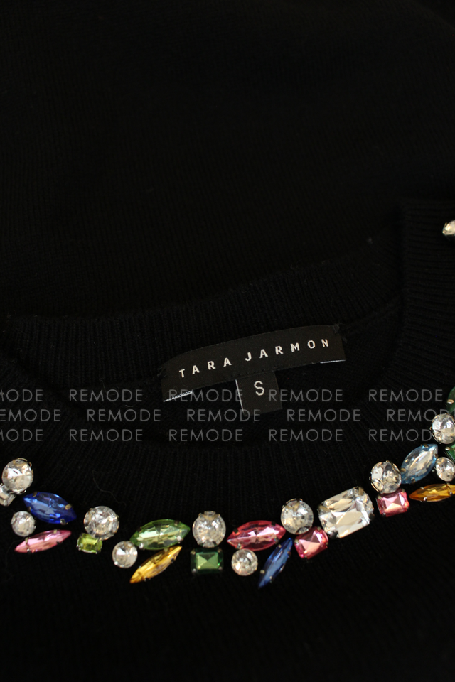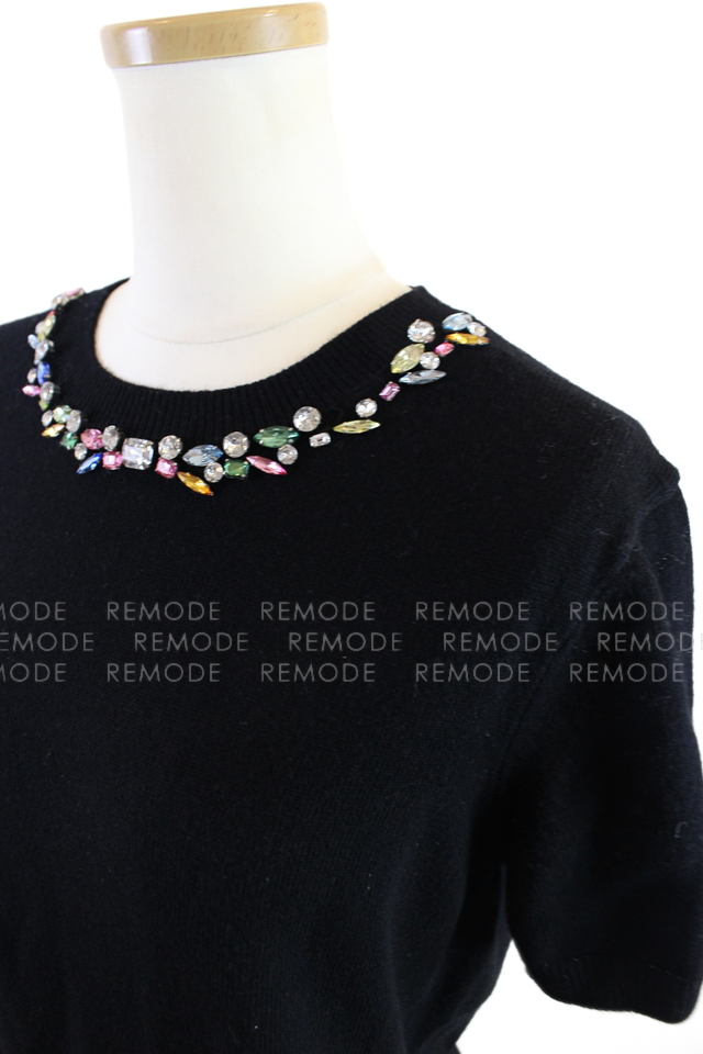 - 襟元にあしらわれたカラフルなビジューが顔まわりを華やかに照らすTARA JARMONの半袖ニット。毛90%・カシミヤ10%の上質な糸で編まれ、しなやかで優しい肌ざわりが魅力です。シンプルなブラックでも一枚で存在感があり、スカートにもパンツにも合わせやすい、デイリーからお食事シーンまで活躍する上品トップスです。