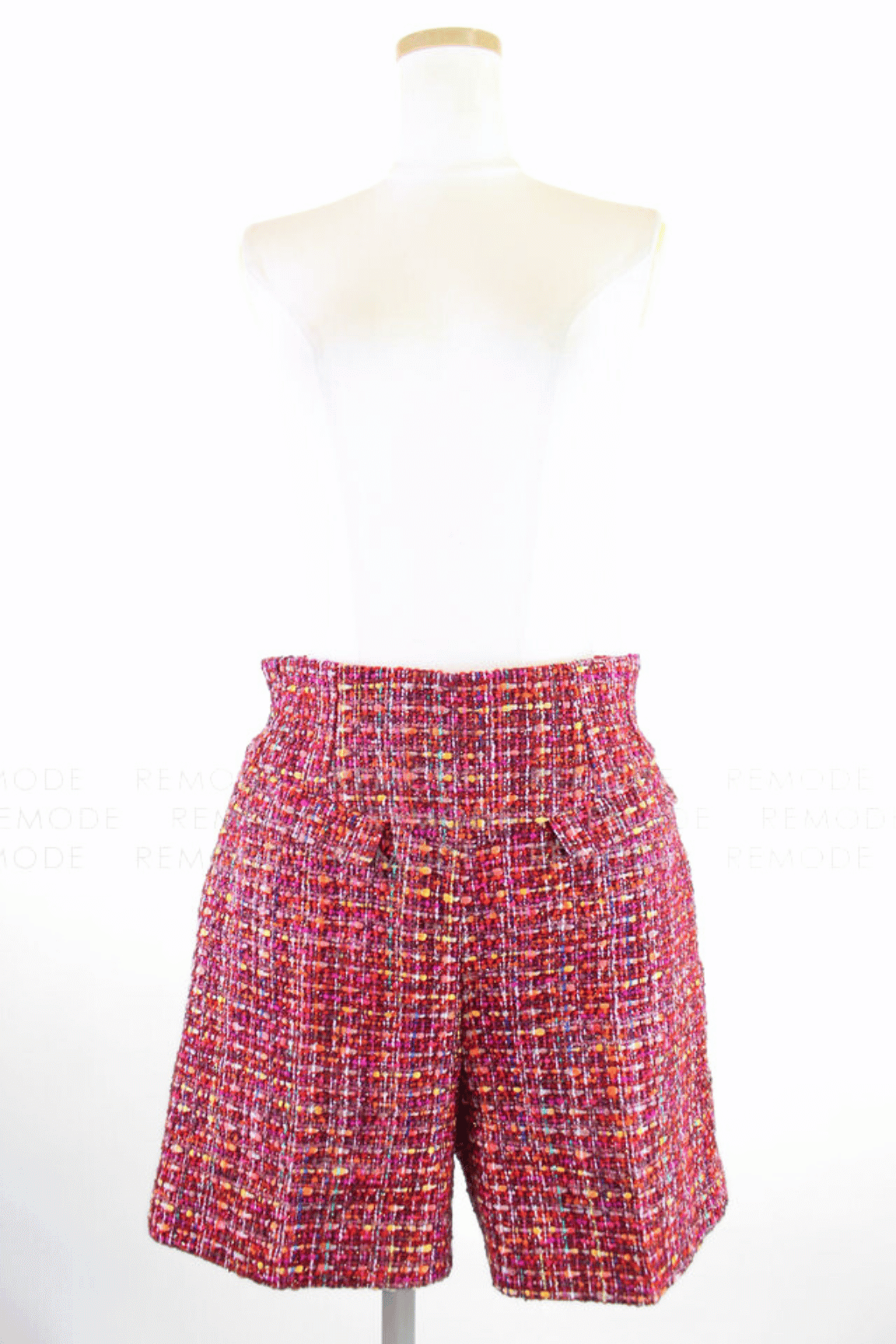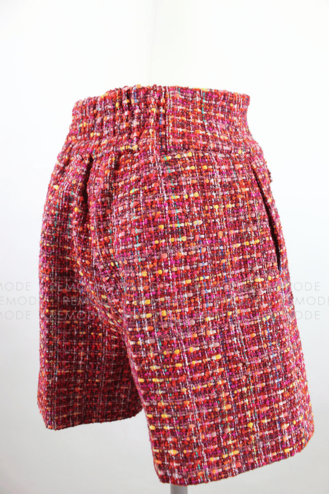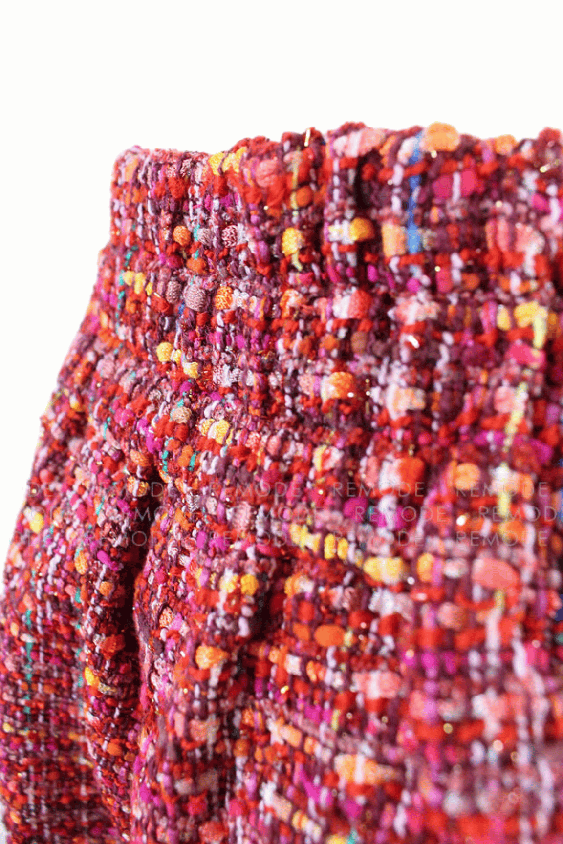 - 鮮やかなレッドが印象的な、イタリア・カンポーレ社のファンシーツイードを使用したキュロット。ピンクやイエロー、ラメ糸を織り込んだ奥行きのある表情が、遠目にも美しく映える上質素材です。膝上の程よい丈感で大人にも取り入れやすく、ベルトレスのハイウエスト仕様がすっきりとした印象に。ヒップ上のフラップディテールがアクセントとなり、自然なスタイルアップを叶えます。同素材のジレとのセットアップや、レースブラウス×ロングブーツのコーディネートもおすすめです。