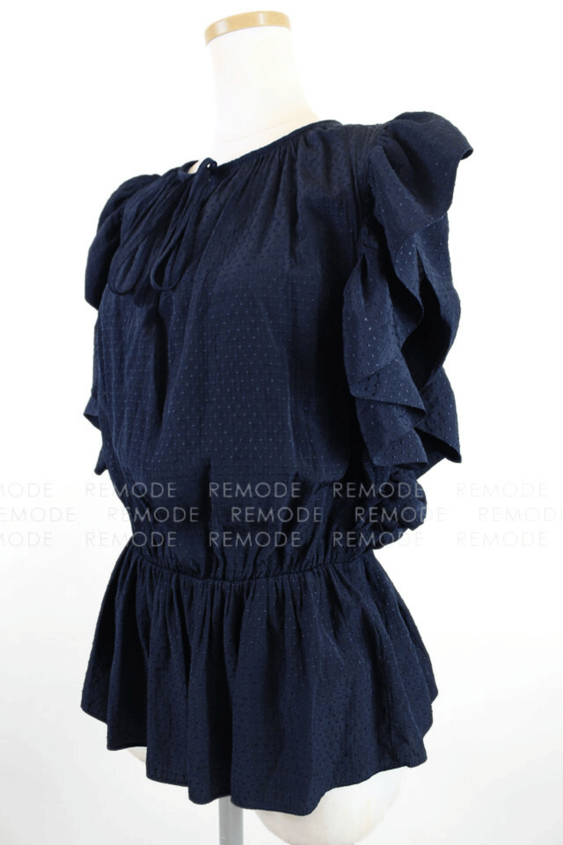 - ネイビー地にさりげないドットを散りばめた、TARA JARMONのペプラムブラウス。肩から袖にかけてたっぷり入ったフリルと、ウエストギャザーからふわりと広がるペプラムシルエットが女性らしい一枚です。デニムでカジュアルにも、細身パンツできれいめにも着回せて、夏のワンツーコーデがぐっと華やぎます。