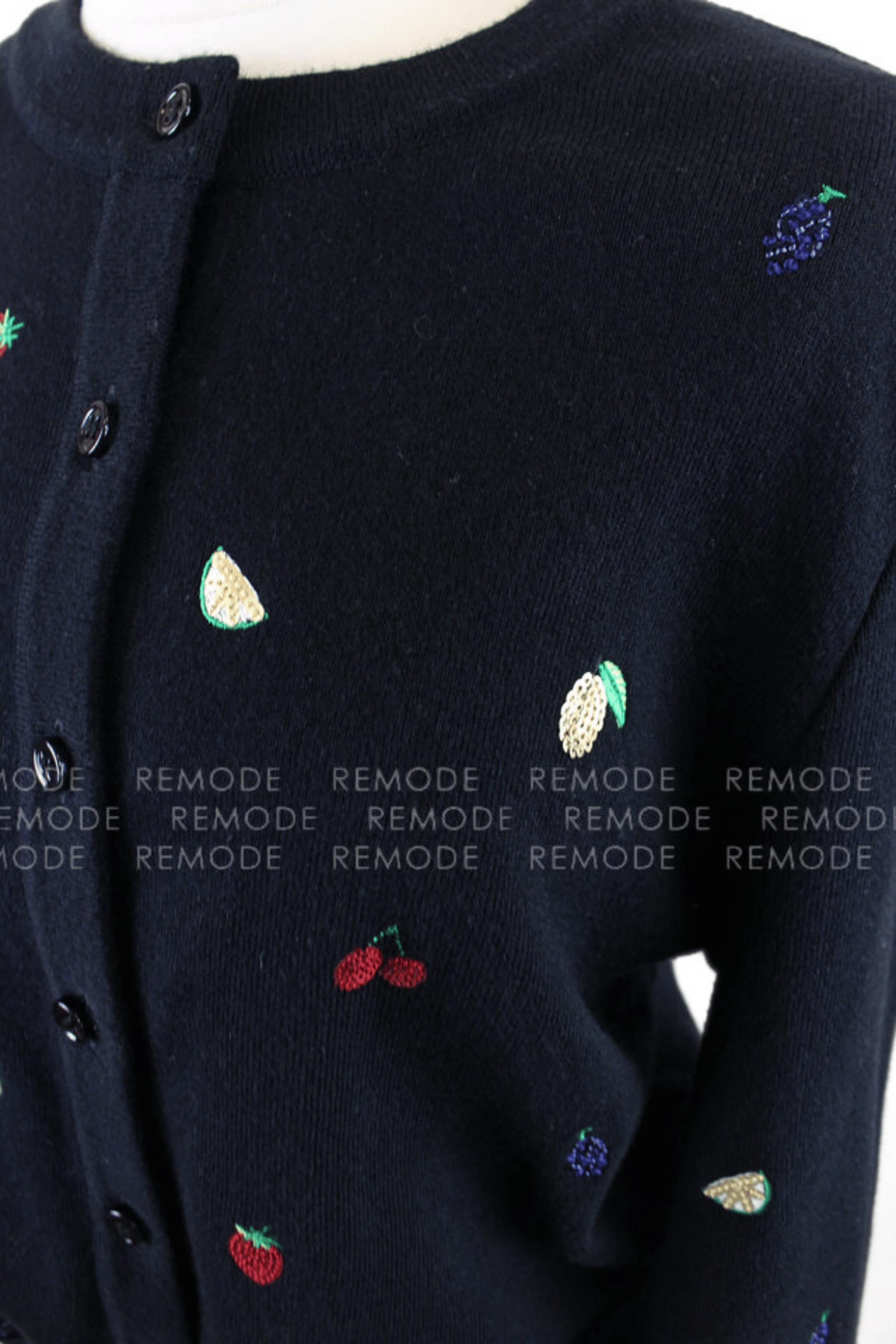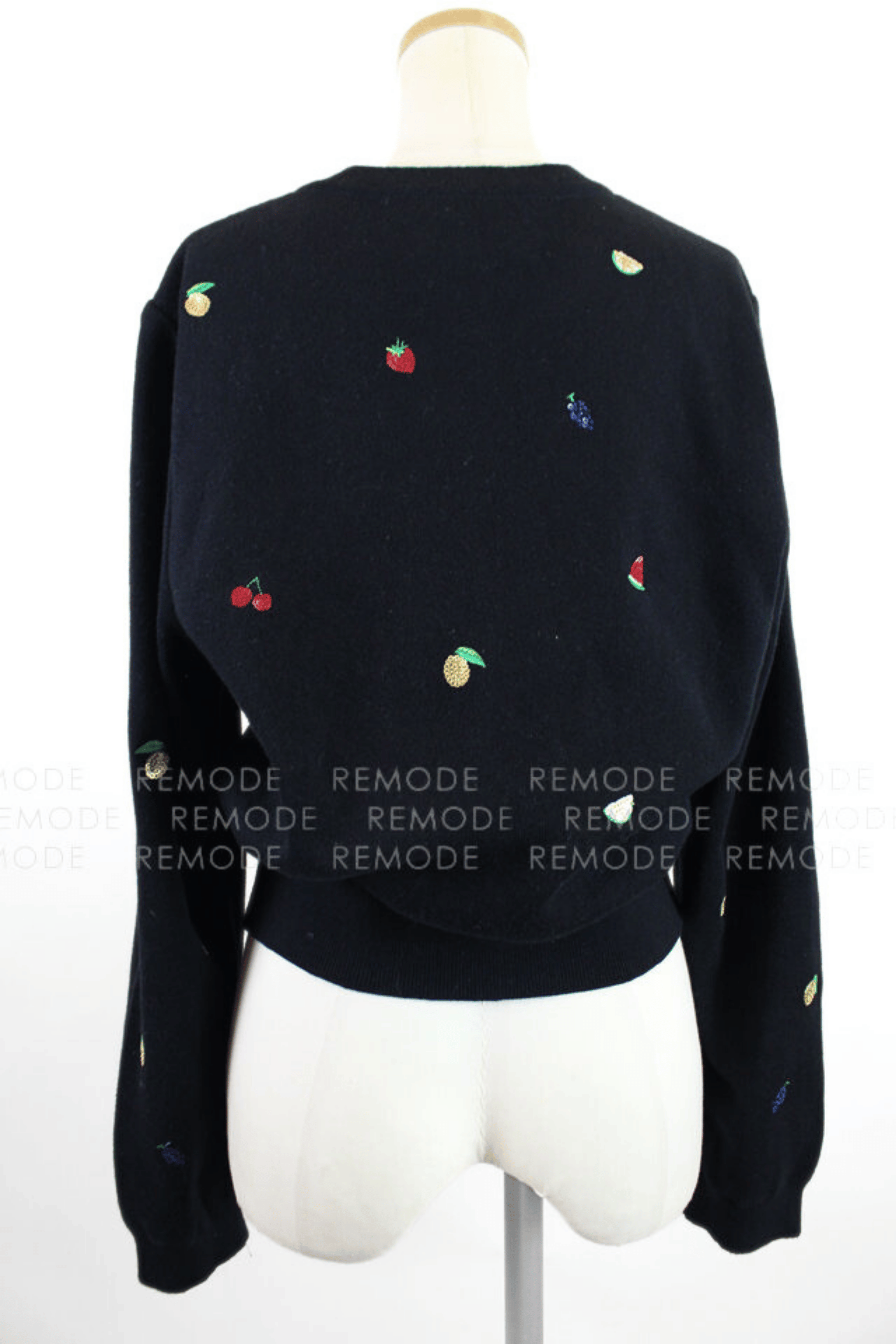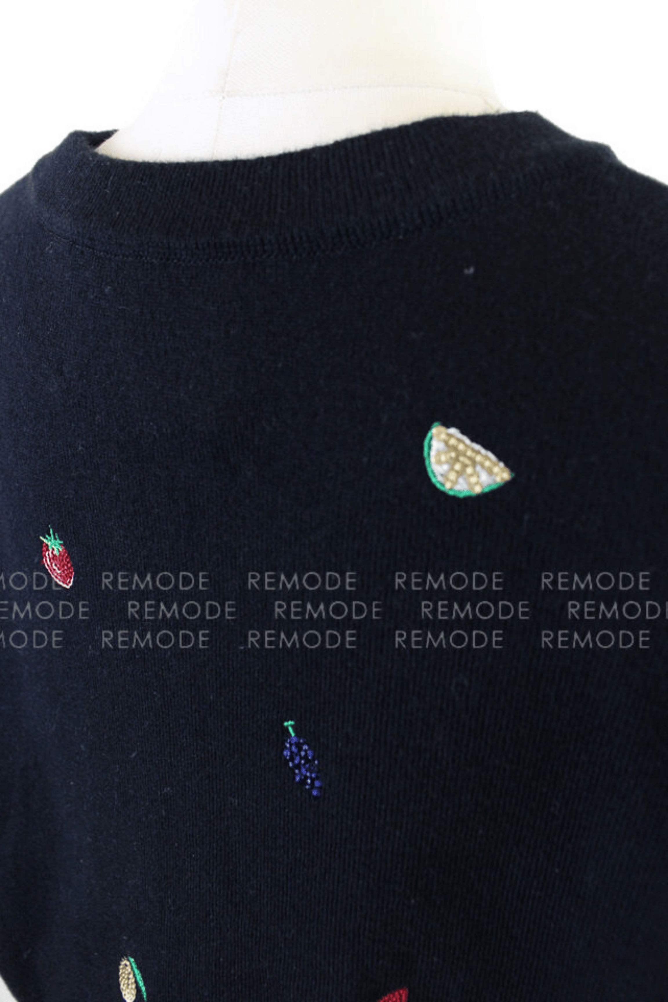 - 6種のフルーツ刺繍を贅沢にあしらった、華やかで品のある一枚。繊細な刺繍にはスパンコールを散りばめ、動くたびにさりげない煌めきを放ちます。短め丈のコンパクトなシルエットが美しいバランスを生み、同色染めの貝ボタンが上質感をプラス。パンツにもスカートにも合わせやすいデザインです。カシミヤと超長綿をブレンドした高級天然素材を使用し、なめらかな肌触りと美しい表面感を兼ね備えた贅沢な仕上がりです。