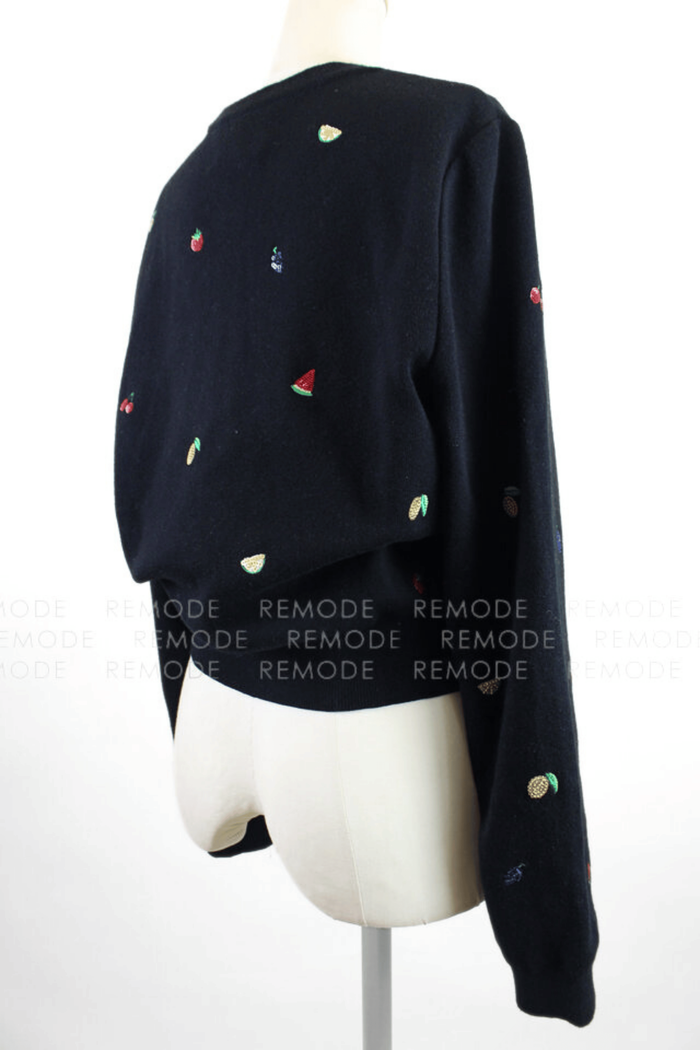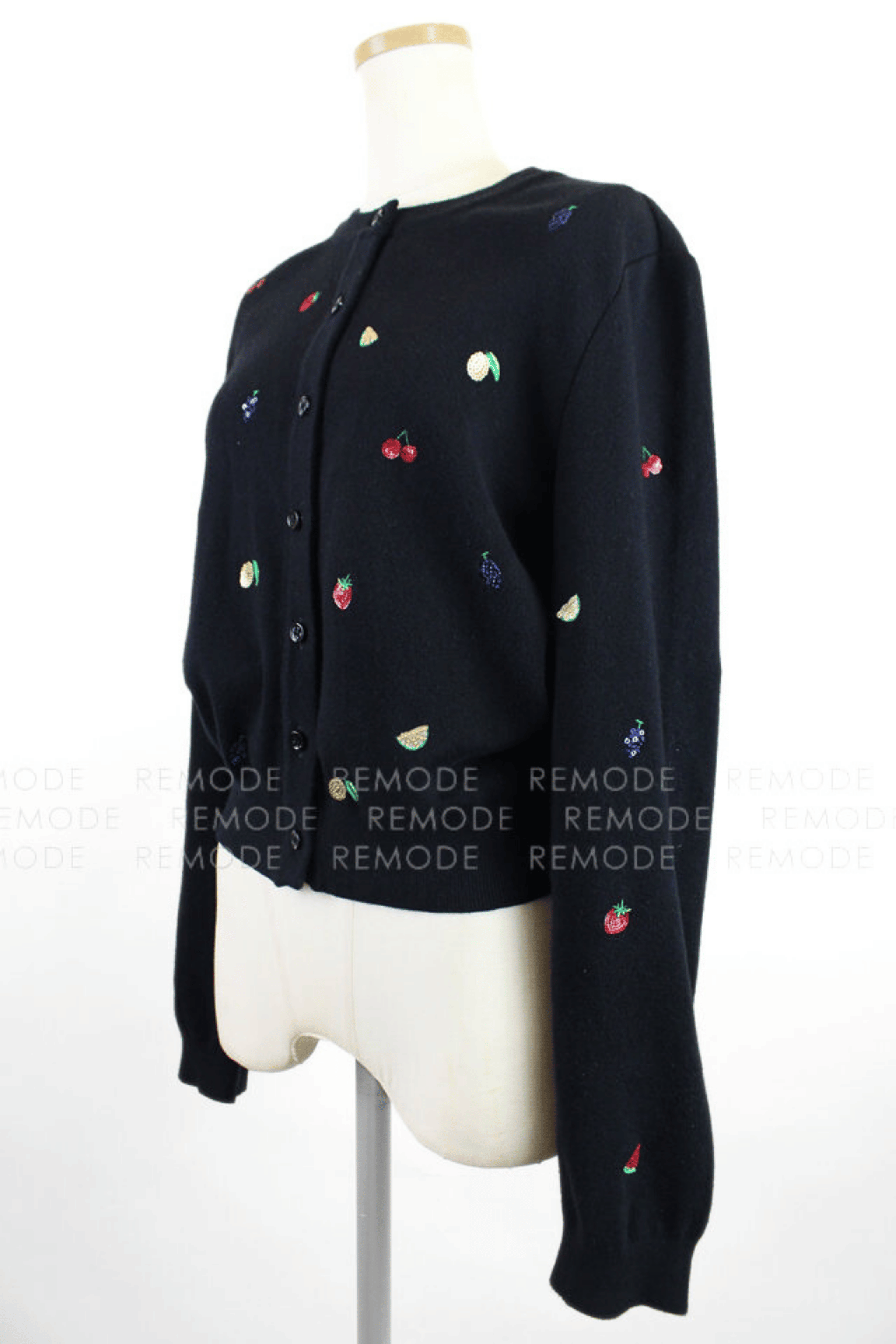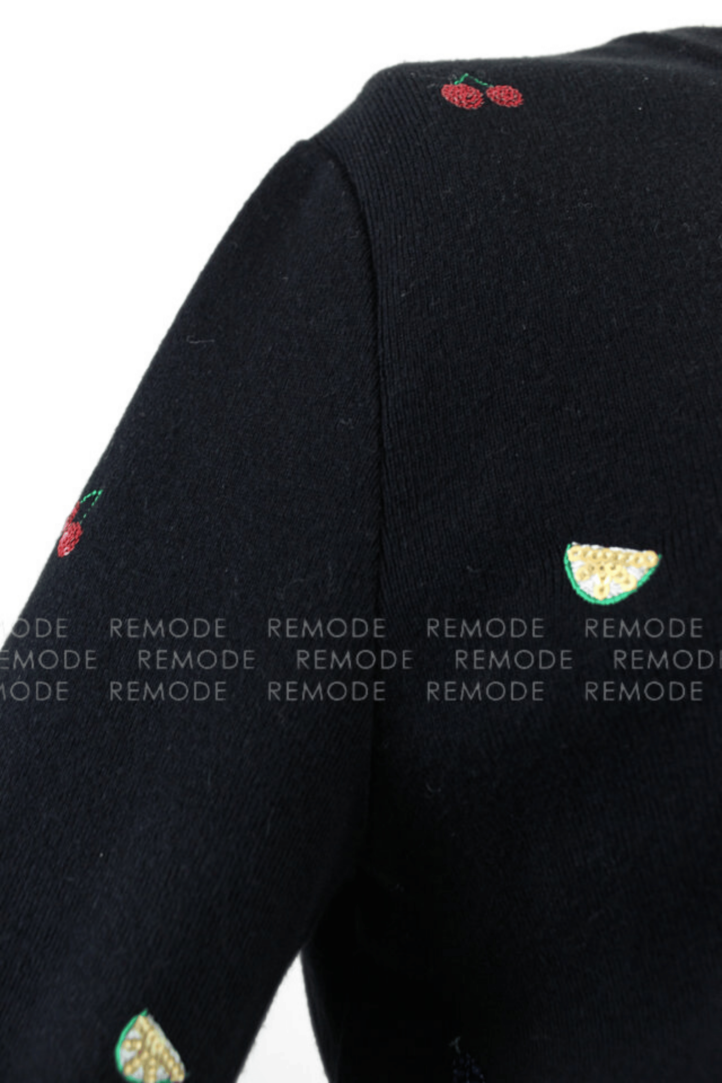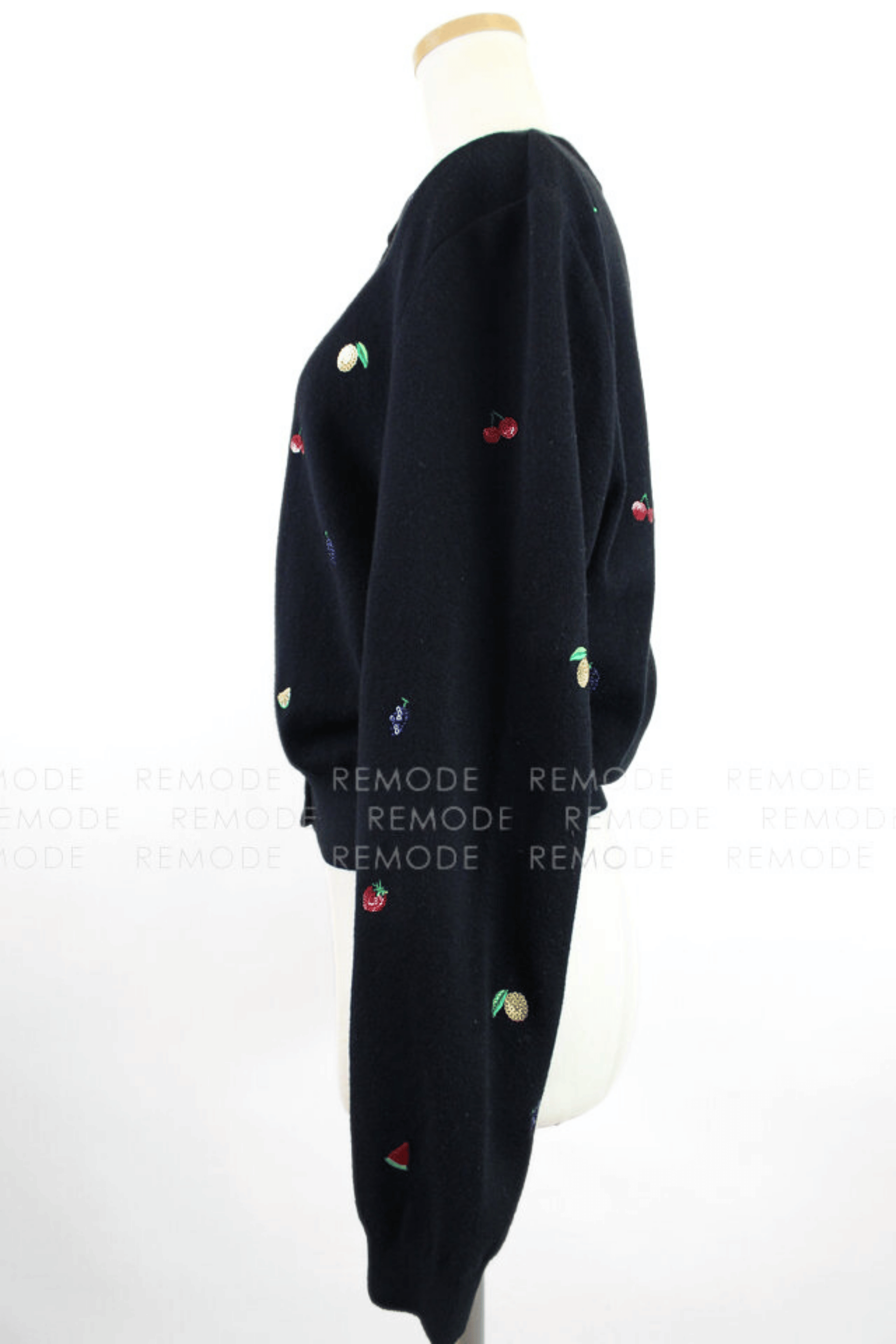 - 6種のフルーツ刺繍を贅沢にあしらった、華やかで品のある一枚。繊細な刺繍にはスパンコールを散りばめ、動くたびにさりげない煌めきを放ちます。短め丈のコンパクトなシルエットが美しいバランスを生み、同色染めの貝ボタンが上質感をプラス。パンツにもスカートにも合わせやすいデザインです。カシミヤと超長綿をブレンドした高級天然素材を使用し、なめらかな肌触りと美しい表面感を兼ね備えた贅沢な仕上がりです。