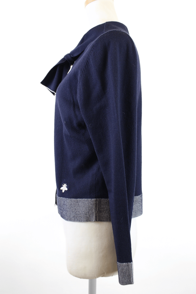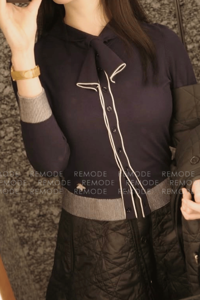 - 短め丈のコンパクトなシルエットが美しいバランスを叶える一枚。胸元には引き返し編みのリボンタイをあしらい、洗練された印象を演出します。パイピングや裾の細やかなストライプが程よい抜け感を加え、デニムやスカートなど幅広いアイテムと好相性。型崩れしにくい加工を施しており、ご自宅で手洗いも可能です。