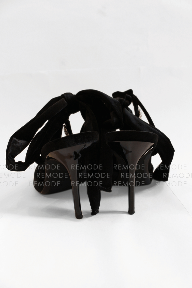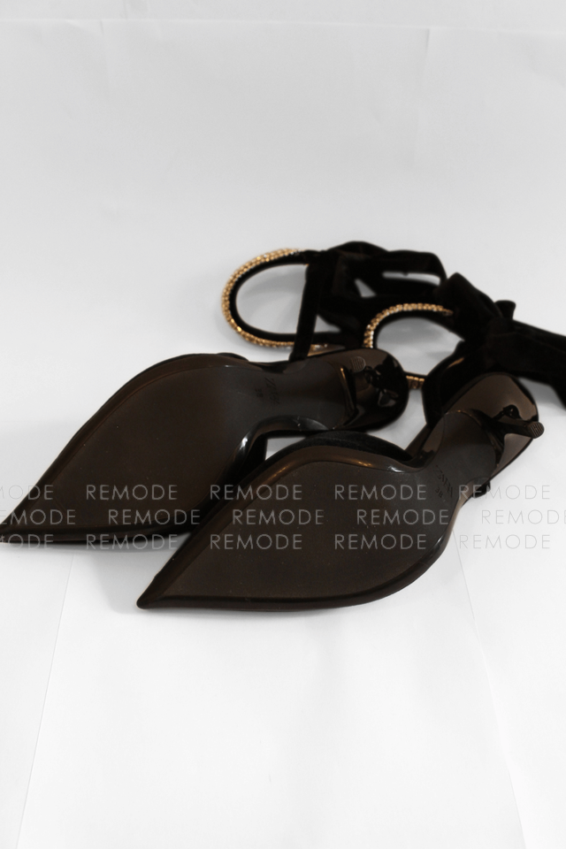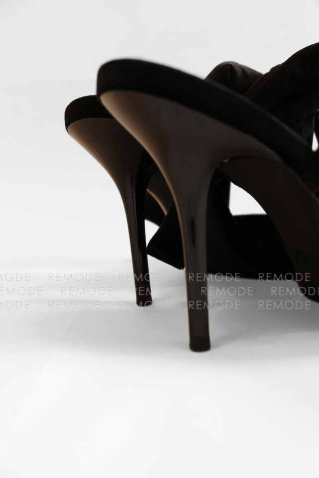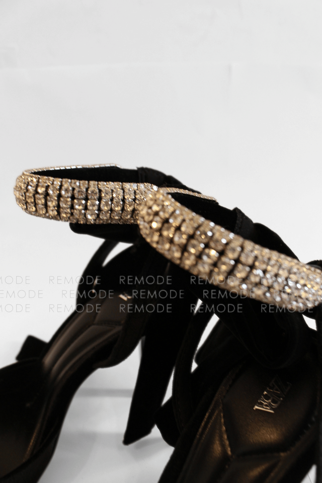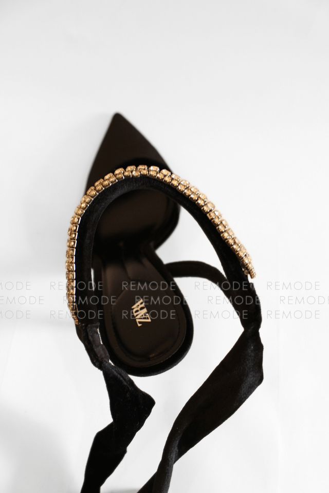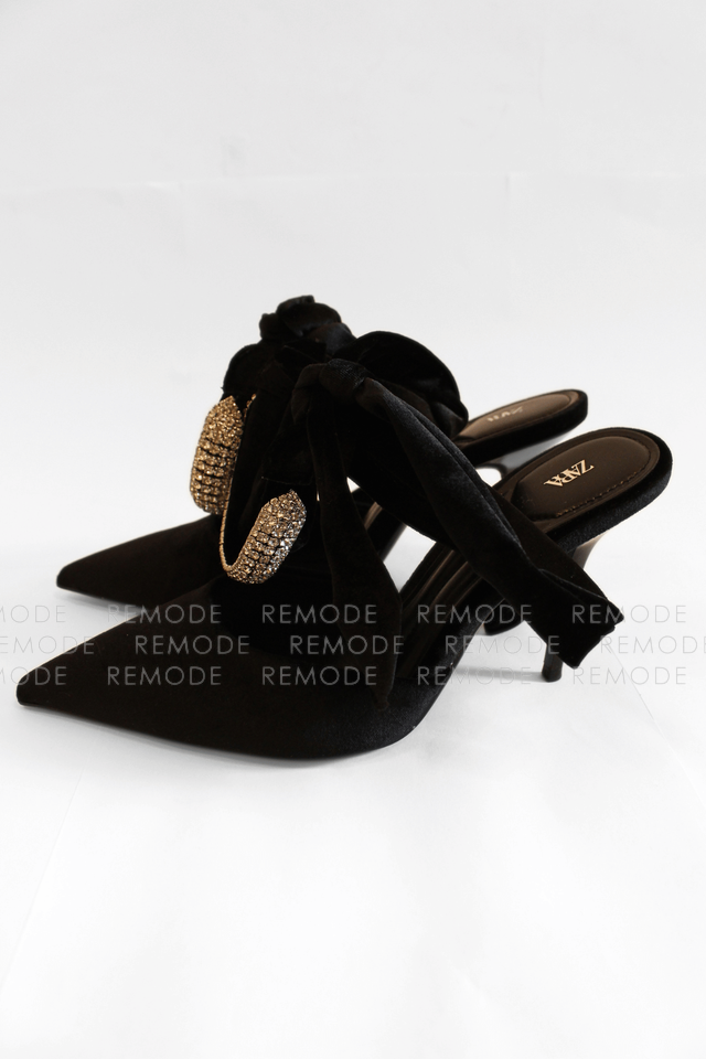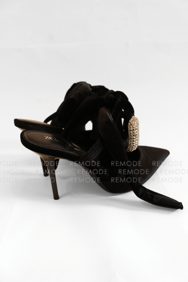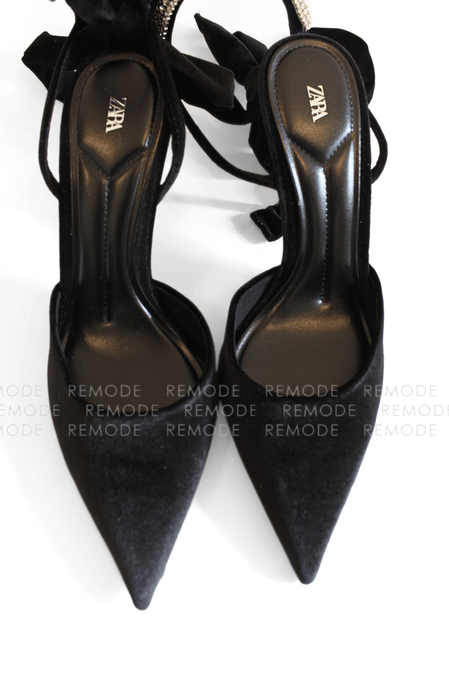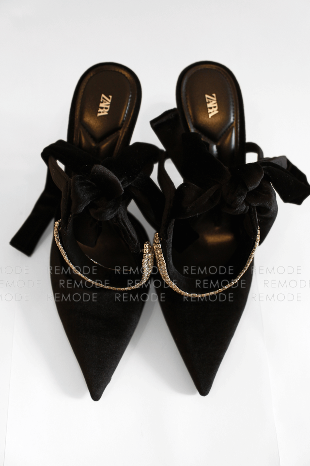 - ZARAのベロア素材がリュクスなポインテッドトゥミュール。甲のビジューラインと足首に結ぶリボンが、足元を華奢でフェミニンに演出してくれます。デニムやワンピースに合わせるだけで、パーティーやお食事会にも映える大人可愛い一足です。
