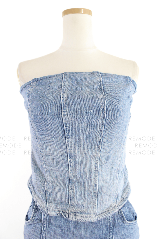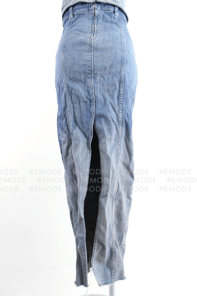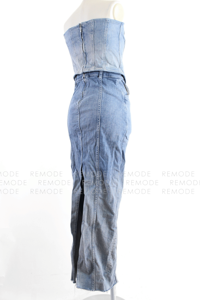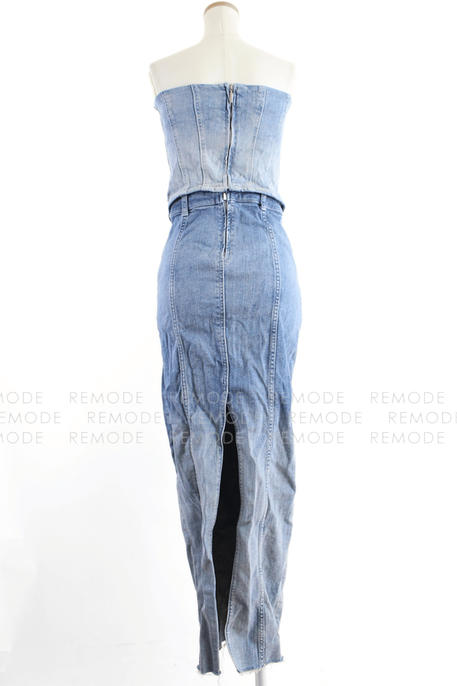 - ZARAのデニムセットアップ。コルセット風に切替ラインを入れたビスチェと、縦ラインを強調するタイトロングスカートの組み合わせで、スタイルアップ効果抜群。バックジップと深めスリットで歩きやすく、シンプルなデニムでも女っぽく着こなせる一枚。上下別々でも着回せる万能アイテムです。