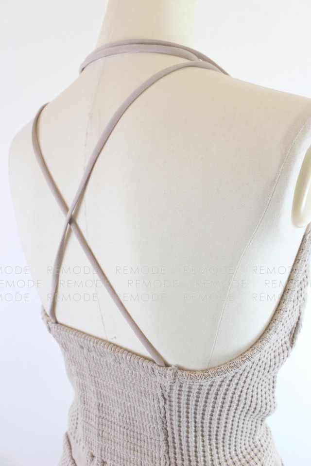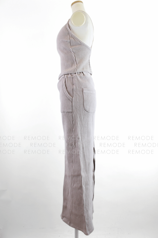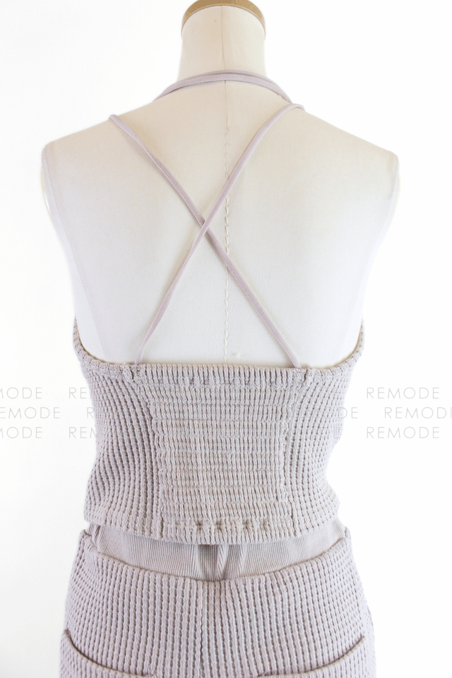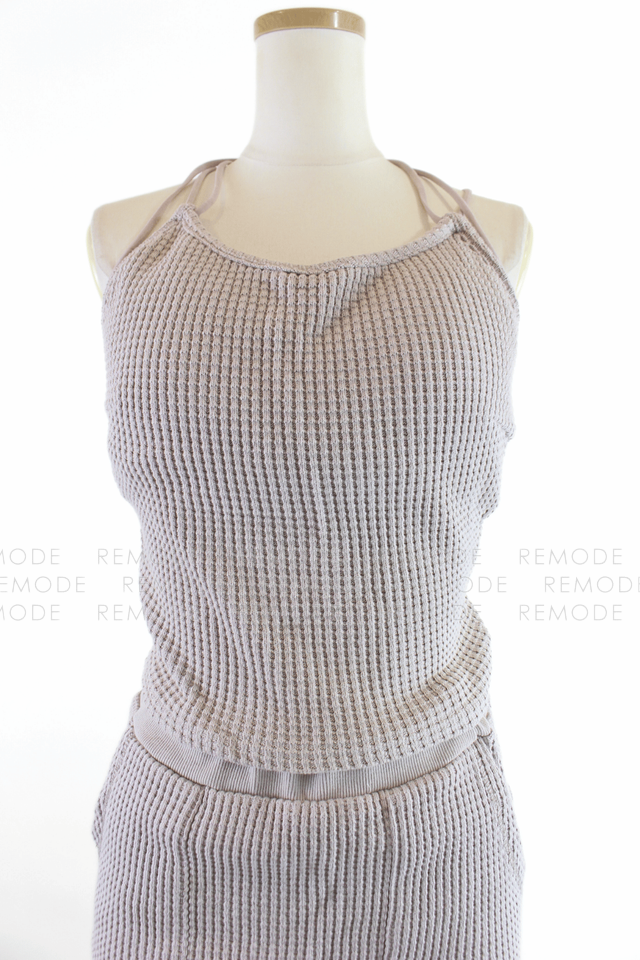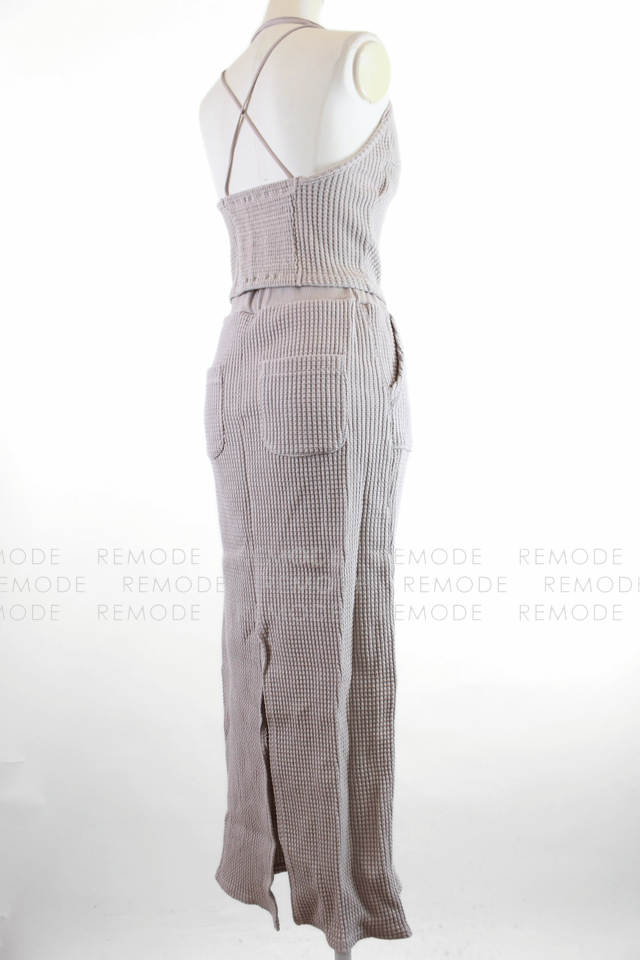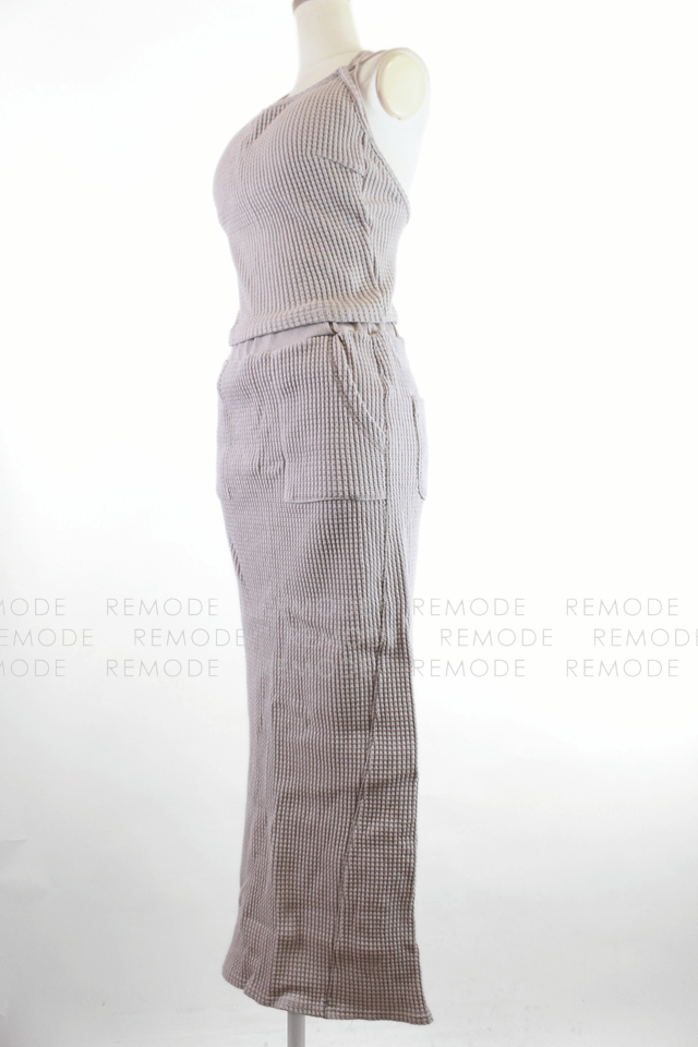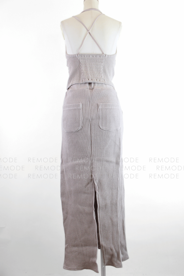 - ワッフル編みニット素材が心地よいTo the seaのセットアップ。華奢なストラップのニットキャミと、バックポケット&スリット入りのタイトロングスカートで、大人ヘルシーな肌見せスタイルが叶います。伸縮性がありリラクシーな着心地ながら、縦長ラインでスタイルアップ効果も。リゾートやタウンユースにも活躍する一着です。
