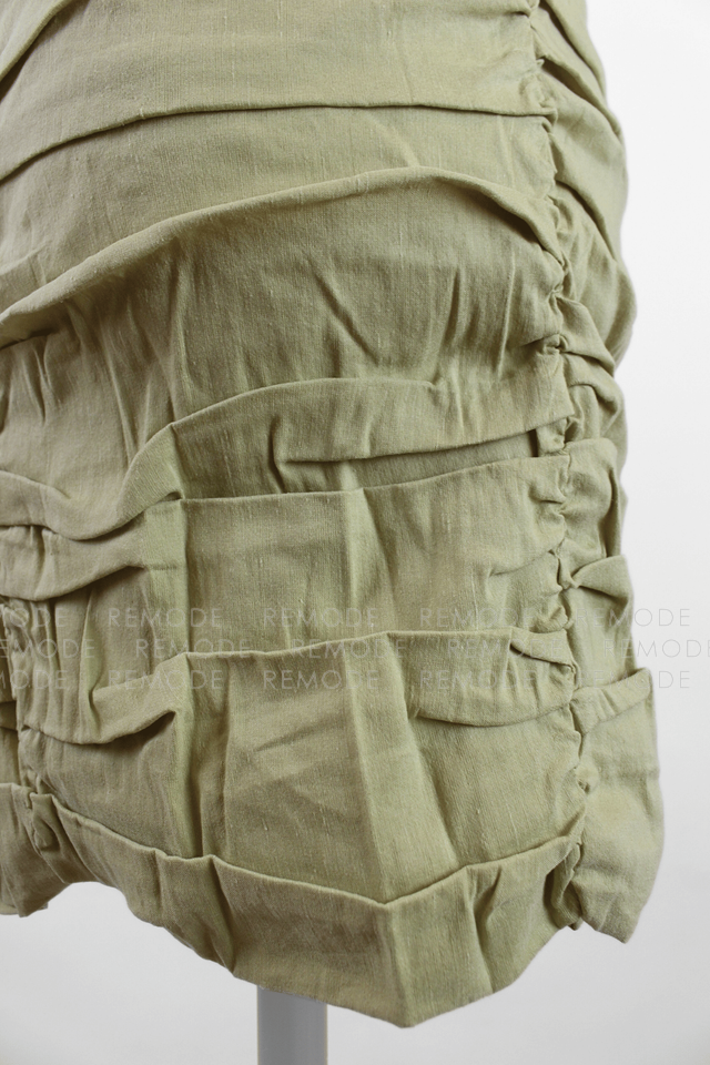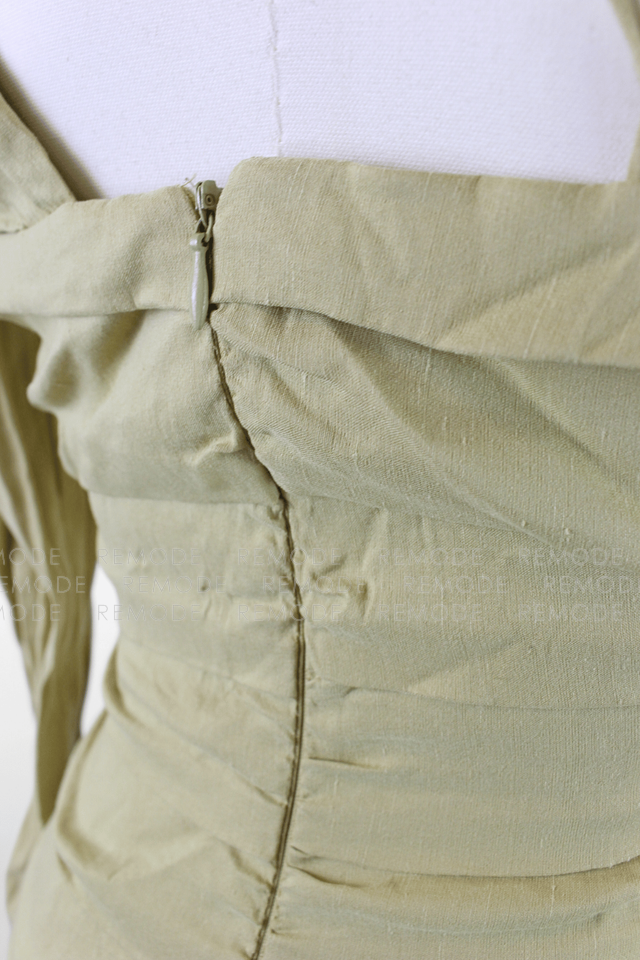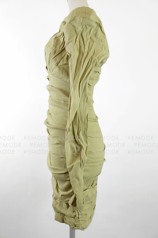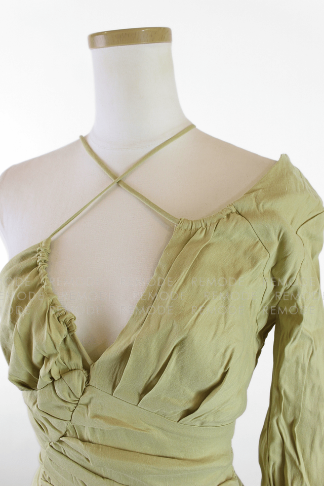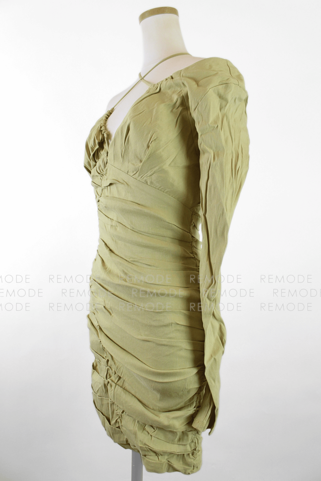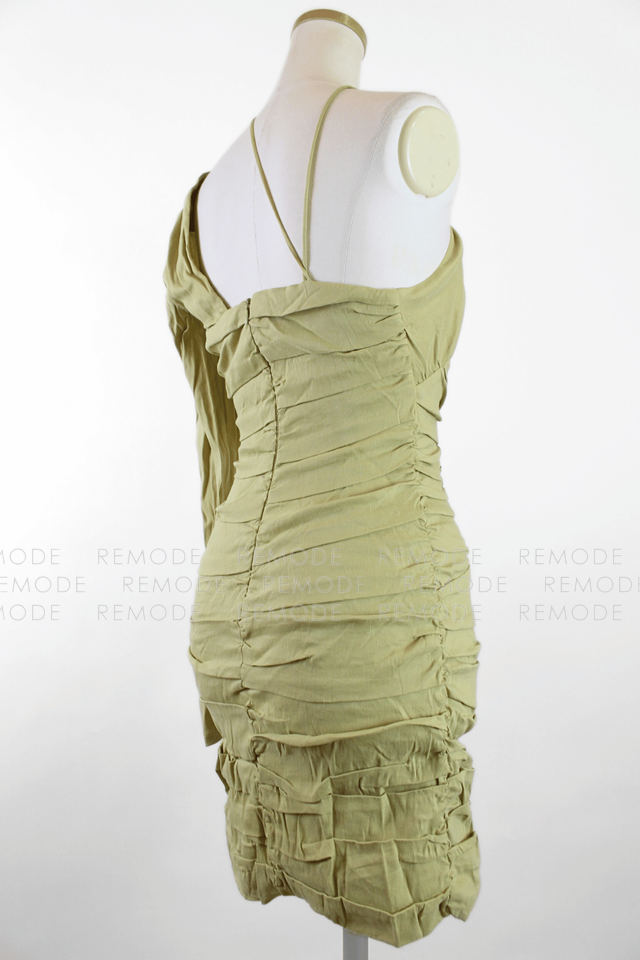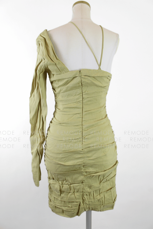 - 片側だけのスリーブと華奢なクロスストラップが目を引くアシンメトリーデザインのタイトミニワンピース。ボディラインに沿って入ったギャザーが立体感を生み、気になる部分をさりげなくカバーしながら女性らしいシルエットを演出します。ニュアンスのあるカーキベージュカラーで、ナイトアウトやイベント、パーティーシーンに映える一着です。
