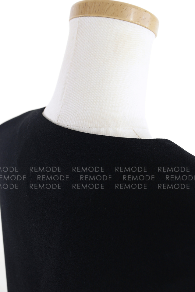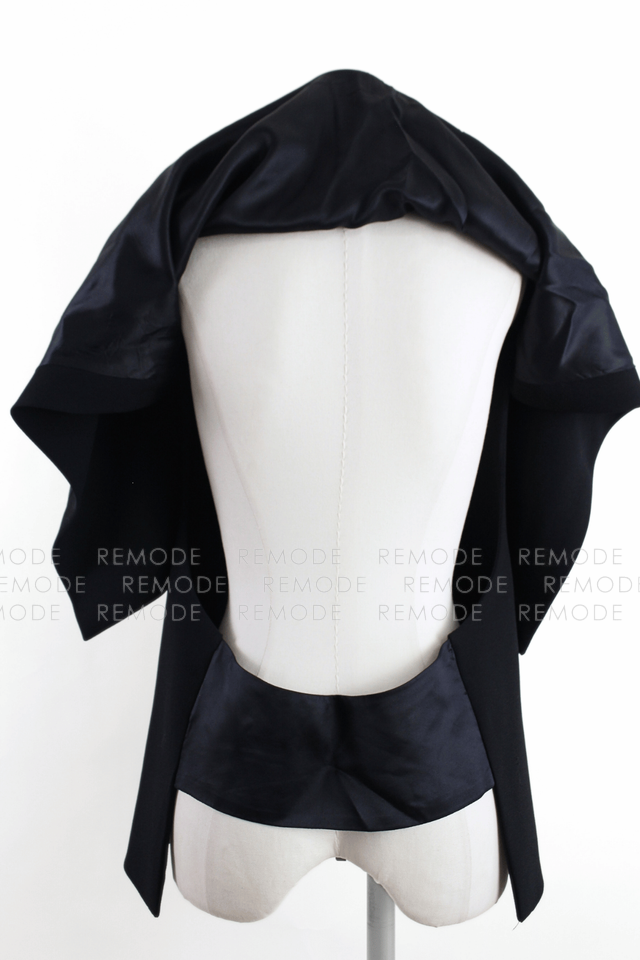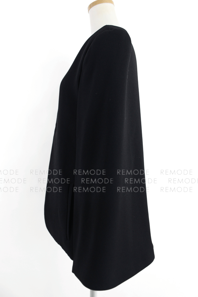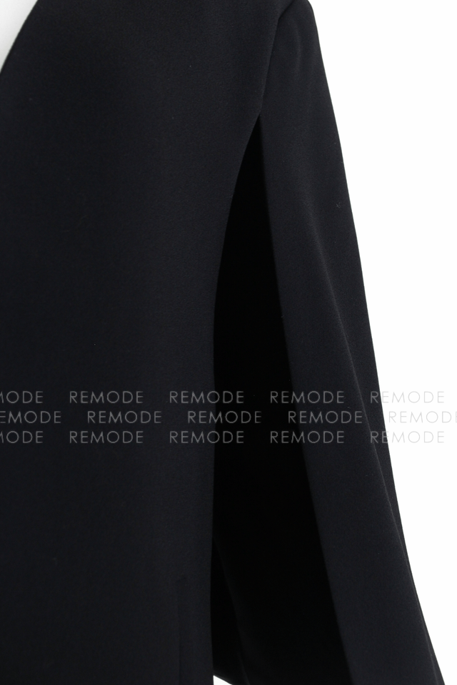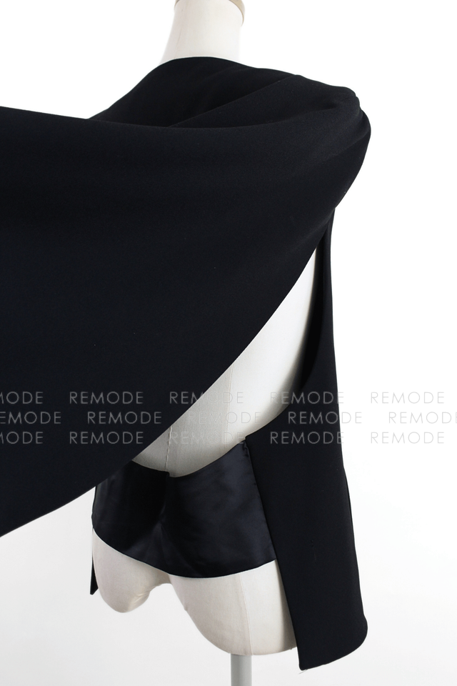 - 前はすっきりとしたベスト仕様、後ろはバックオープンスタイル、ジャケット丈のマントのようにふわりとかかるケープデザインで、どの角度から見てもモードな印象に。ノースリーブトップスやワンピースに重ねるだけでスタイルが一気にこなれて見える、ブラックの主役級アイテムです。