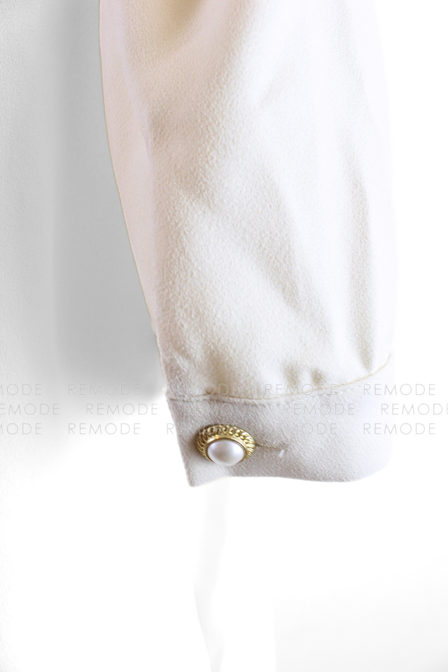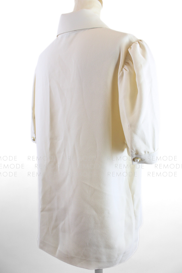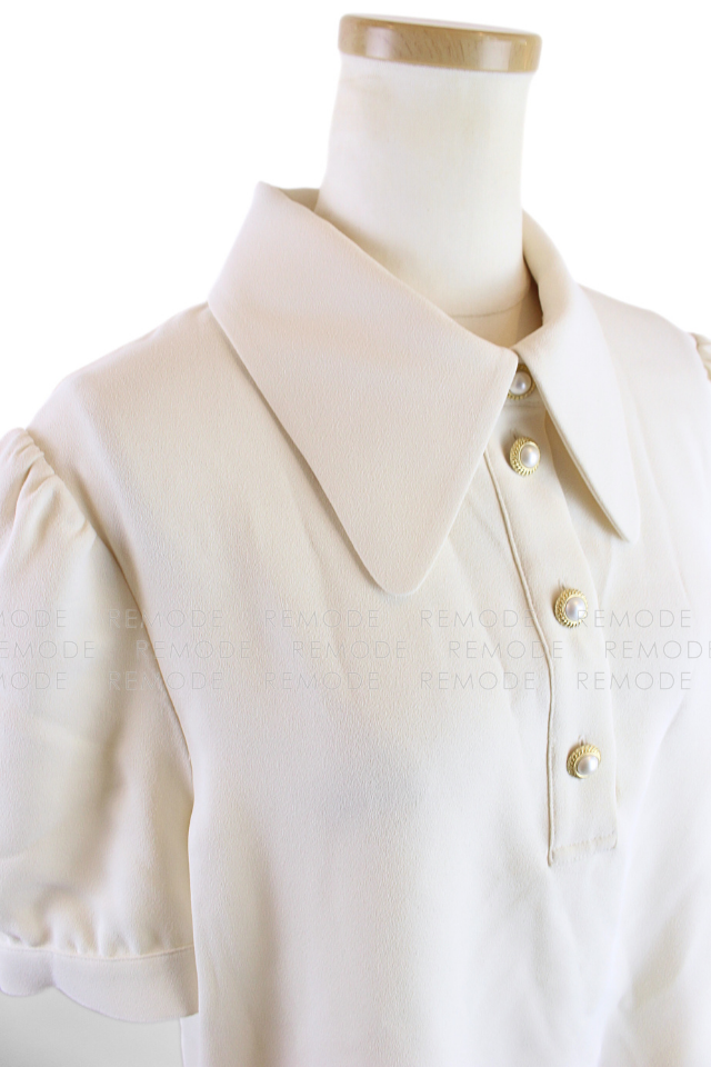 - パフスリーブとパール調ボタンが華やかさを添える、上品なブラウス。