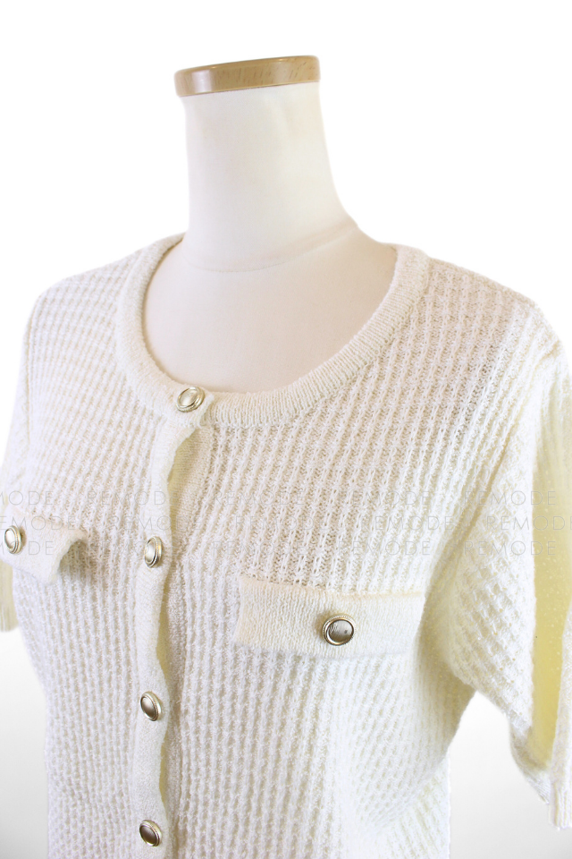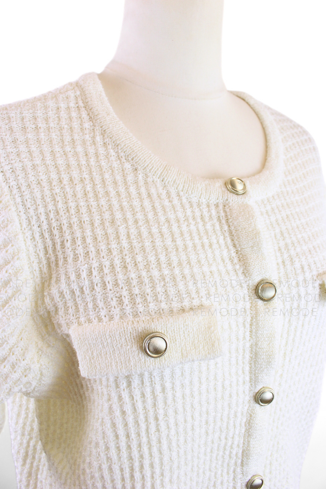柔らかな風合いとゴールドボタンが華やかさを添え、ジャケットのようなきちんと感を演出します。