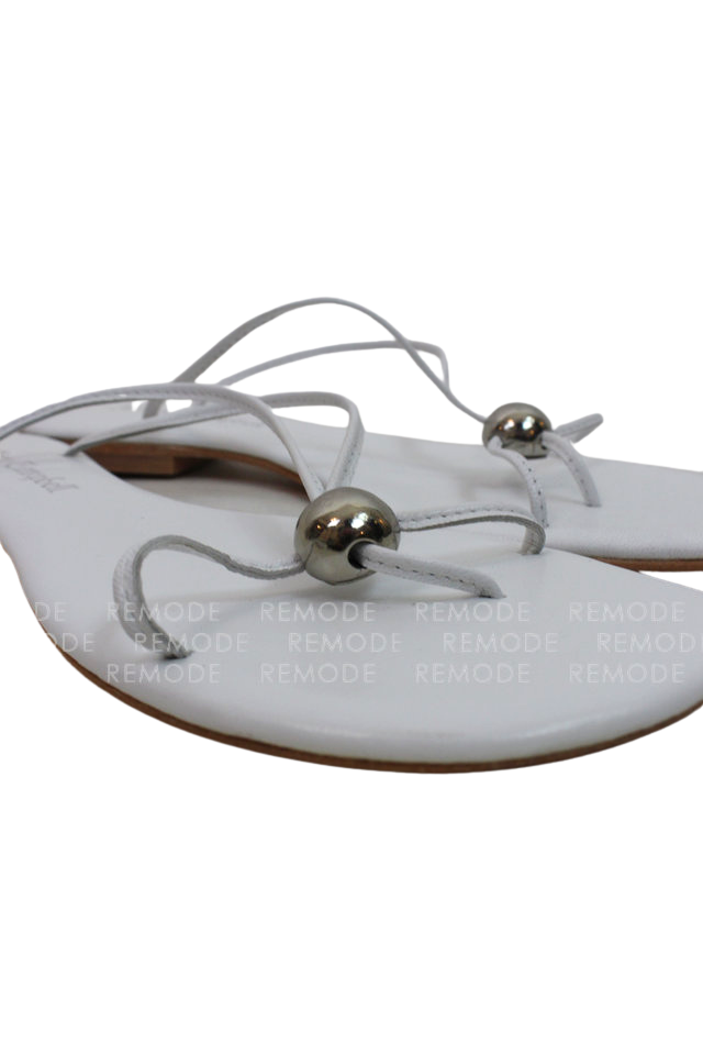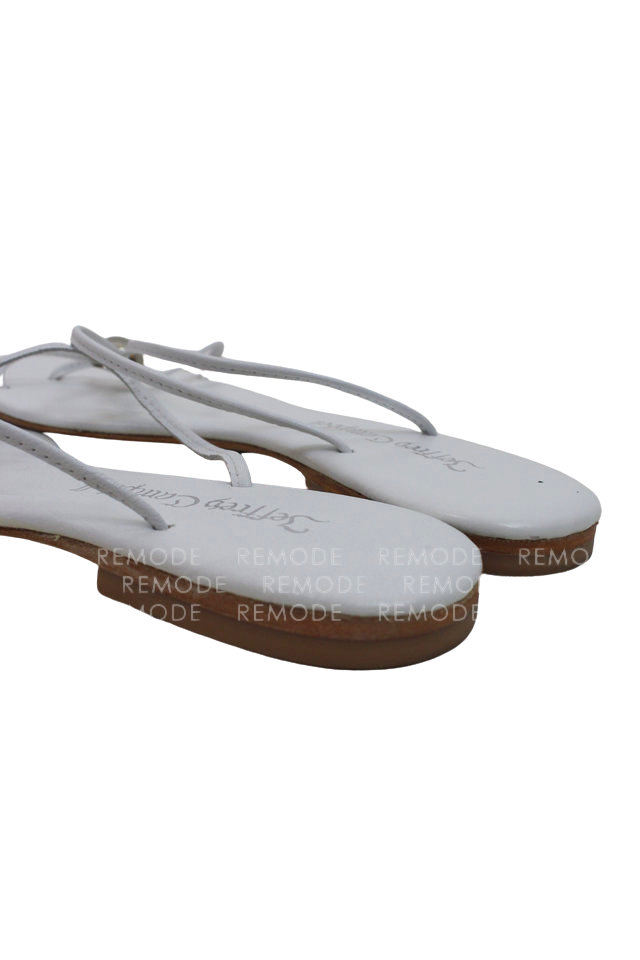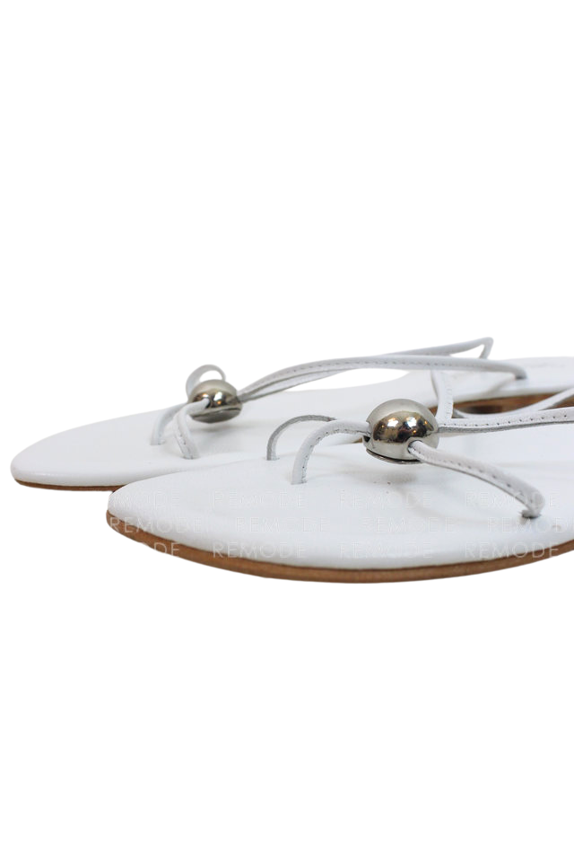 - 洗練されたホワイトレザーに、甲部分にあしらわれたシルバーパーツがアクセントのフラットサンダル。華奢なストラップとスリップオン仕様で、抜け感のある足元を演出します。レザーフットベッドだから素足にも優しく、インド製ハンドメイドならではの上質感も魅力。リゾートやタウンユースに幅広く活躍するアイテム。