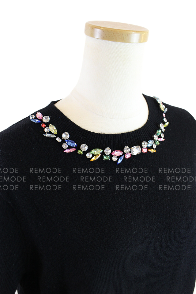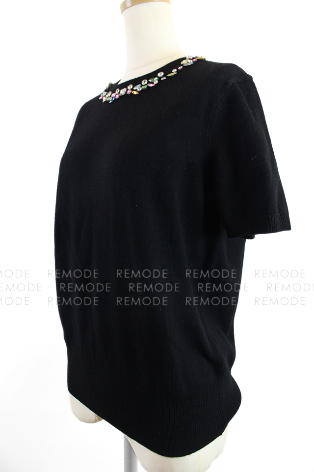 - 襟元にあしらわれたカラフルなビジューが顔まわりを華やかに照らすTARA JARMONの半袖ニット。毛90%・カシミヤ10%の上質な糸で編まれ、しなやかで優しい肌ざわりが魅力です。シンプルなブラックでも一枚で存在感があり、スカートにもパンツにも合わせやすい、デイリーからお食事シーンまで活躍する上品トップスです。