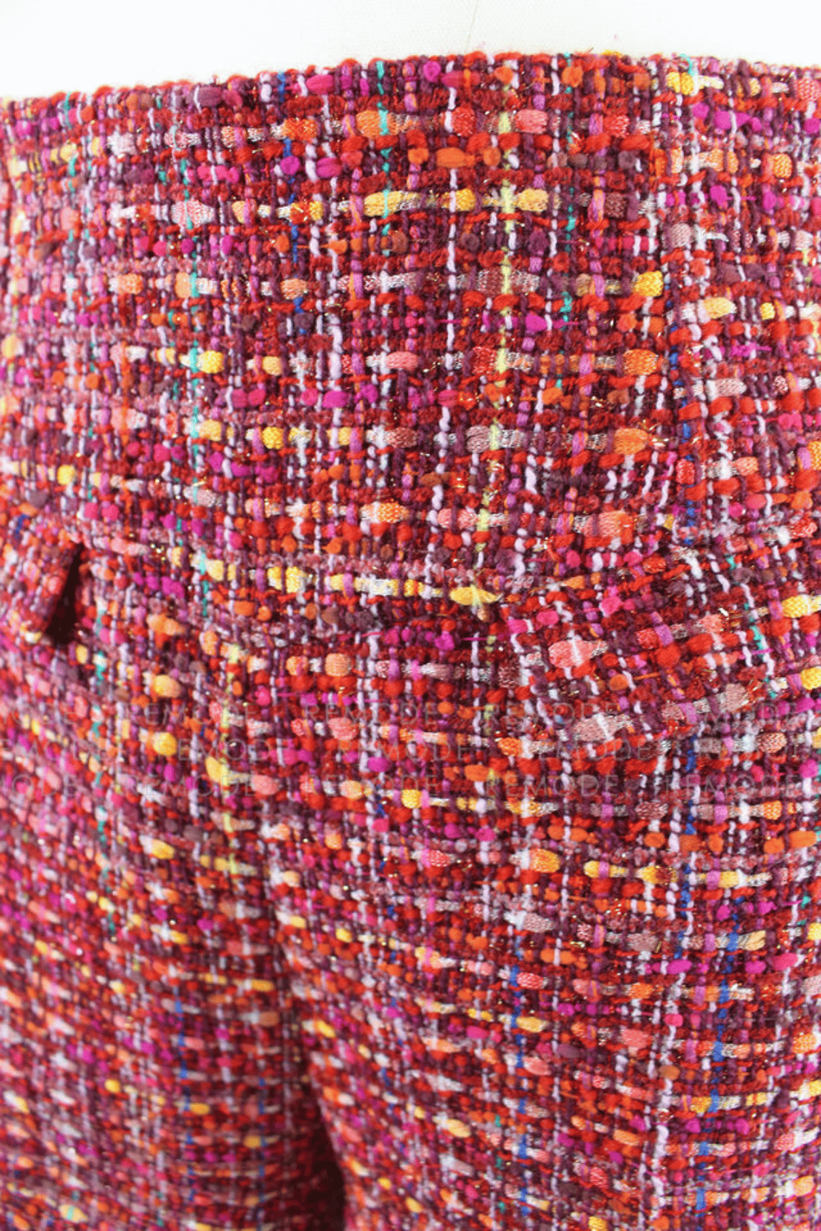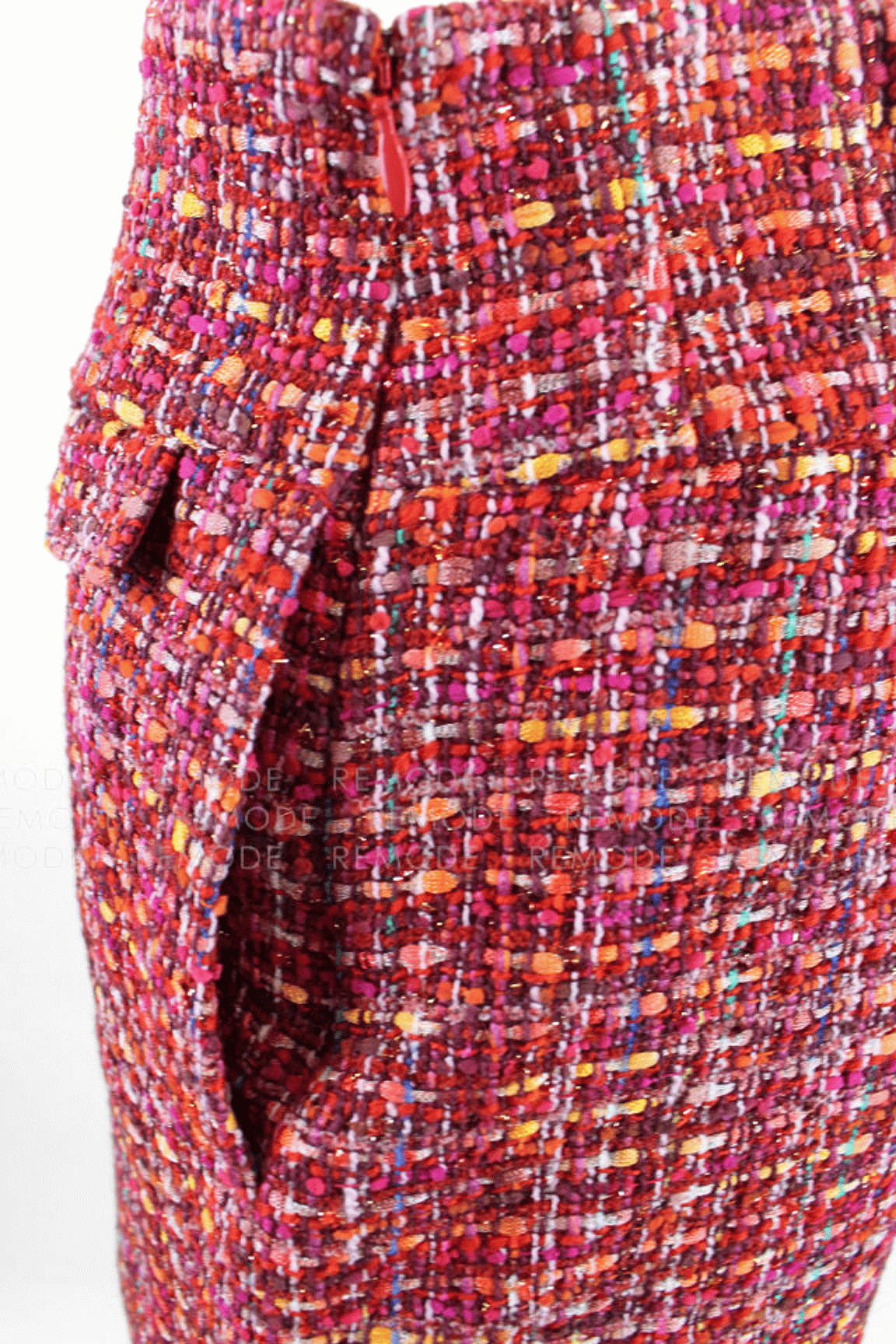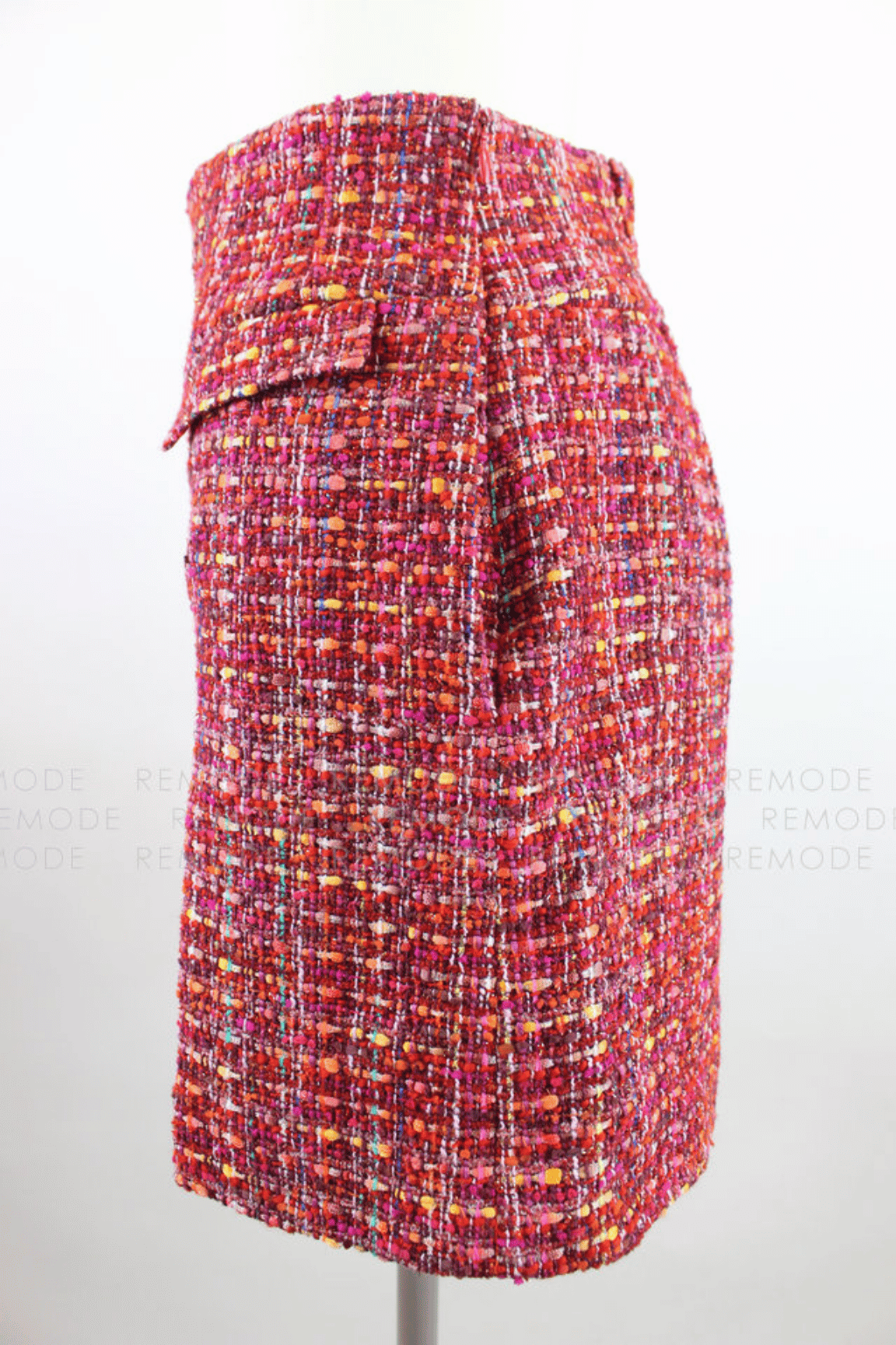 - 鮮やかなレッドが印象的な、イタリア・カンポーレ社のファンシーツイードを使用したキュロット。ピンクやイエロー、ラメ糸を織り込んだ奥行きのある表情が、遠目にも美しく映える上質素材です。膝上の程よい丈感で大人にも取り入れやすく、ベルトレスのハイウエスト仕様がすっきりとした印象に。ヒップ上のフラップディテールがアクセントとなり、自然なスタイルアップを叶えます。同素材のジレとのセットアップや、レースブラウス×ロングブーツのコーディネートもおすすめです。