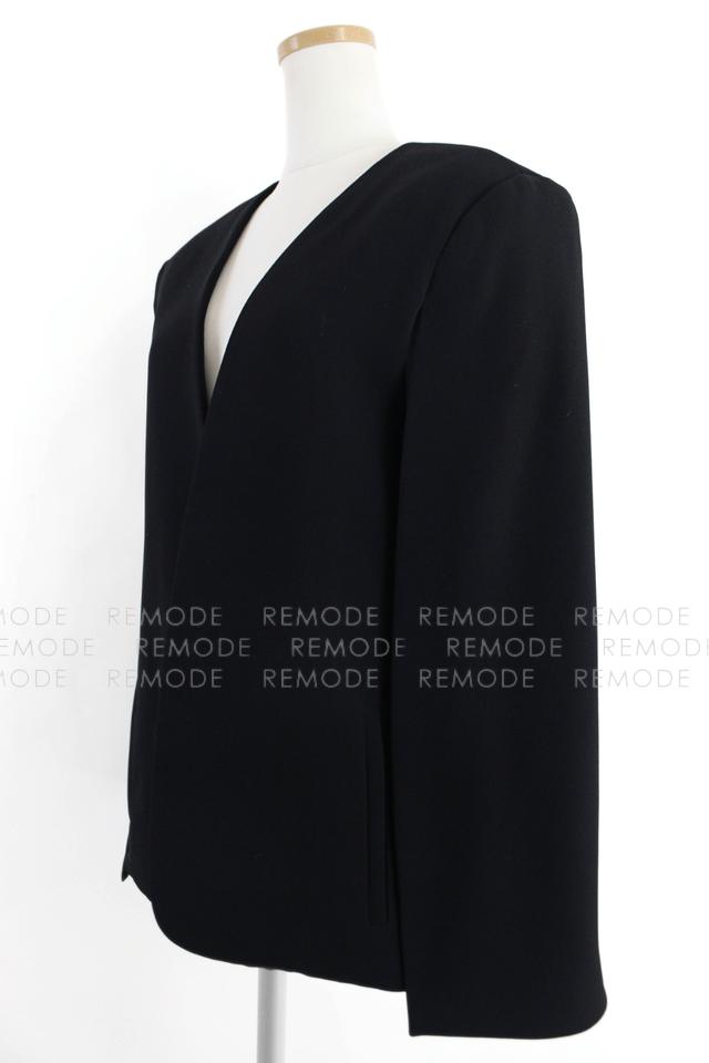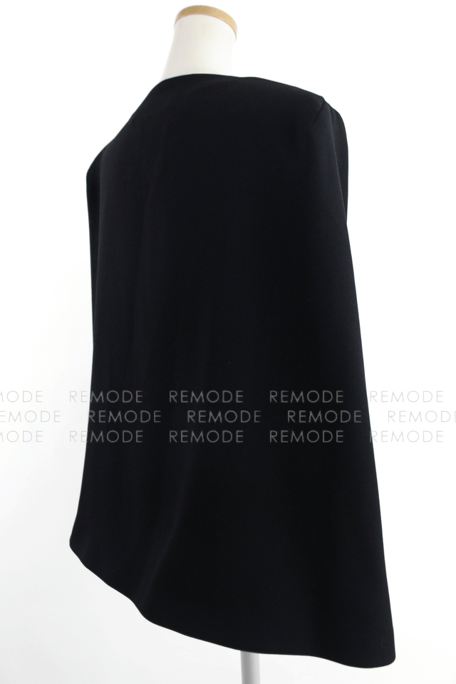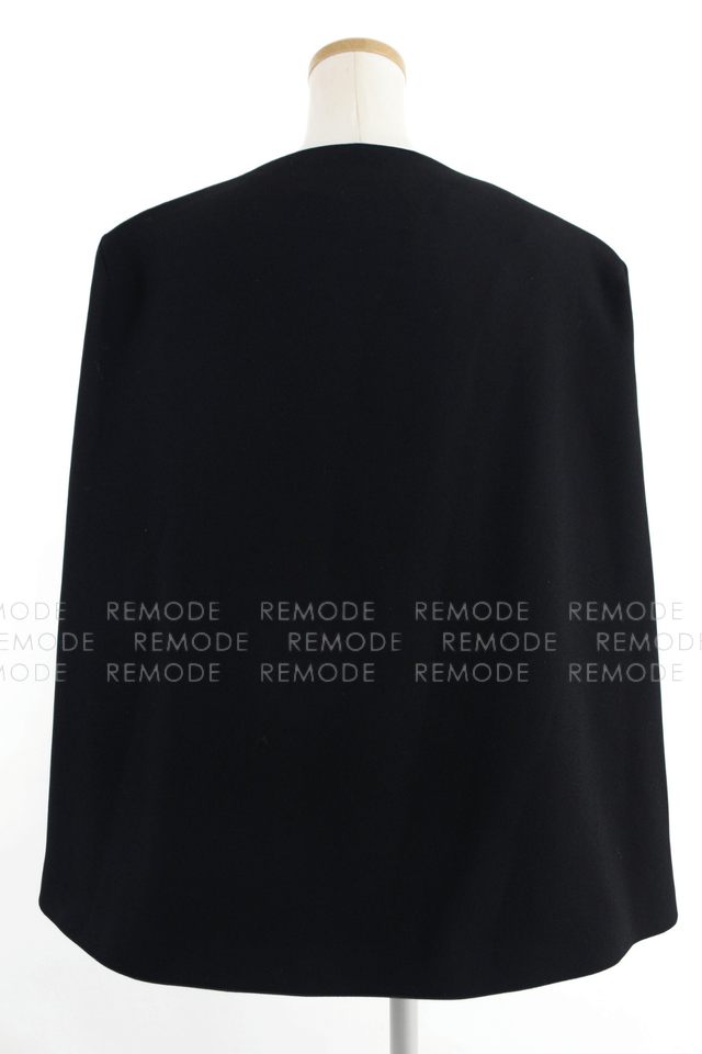 - 前はすっきりとしたベスト仕様、後ろはバックオープンスタイル、ジャケット丈のマントのようにふわりとかかるケープデザインで、どの角度から見てもモードな印象に。ノースリーブトップスやワンピースに重ねるだけでスタイルが一気にこなれて見える、ブラックの主役級アイテムです。