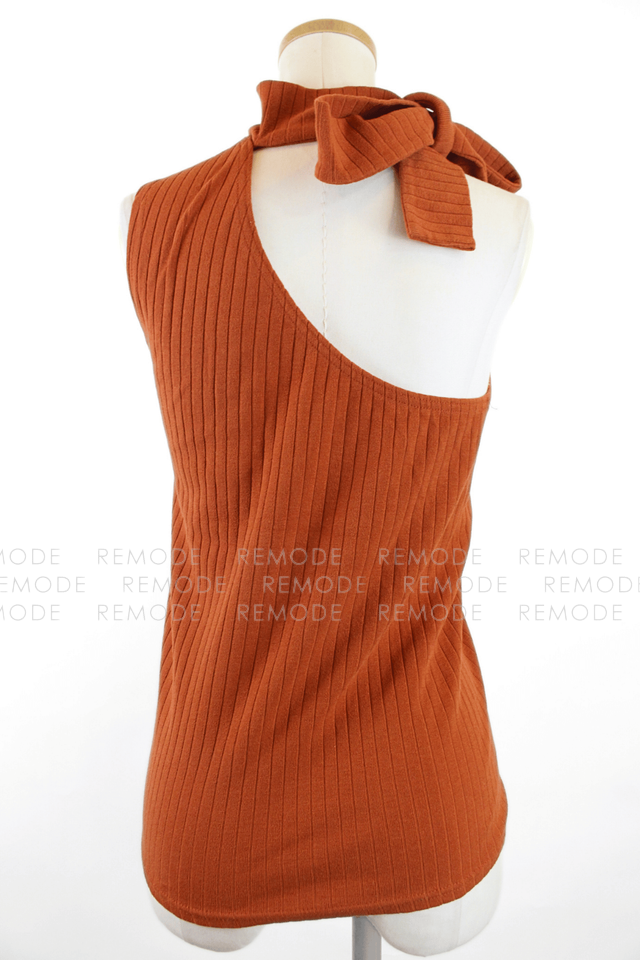 - 首元に巻き付けたリボンと、アシンメトリーなワンショルダーデザインが目を引くEstella.Kのリブニットトップス。身体に優しくフィットするランダムリブが縦ラインを強調し、すっきりとしたシルエットに。こっくりとしたテラコッタカラーでデニムにもきれいめボトムにも相性◎。一枚で主役になる、大人フェミニンなニットです。